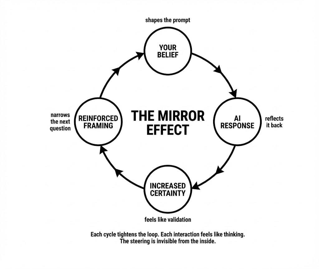Large language models are trained to produce responses users rate highly, and users rate agreement higher than challenge. The practical consequence is a feedback loop: your existing beliefs shape the prompt, the AI reflects them back with fluency and authority, your confidence increases, and the next question carries that reinforced certainty forward. Over extended conversations, assumptions harden. The process feels like collaboration. It functions like a mirror.