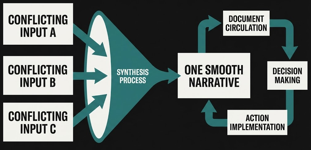 The same compression operates in organisational settings. A strategy team requests a synthesis of market risks for an internal paper. The generated text blends optimistic and cautious signals into a smooth narrative. During review, team members comment on tone and clarity, not on missing counter-arguments. By the time the document reaches leadership, the range of plausible futures has already been narrowed. The disagreement that should have structured the discussion never appears.