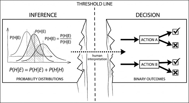 Figure 1 illustrates the boundary that separates two fundamentally different operations. On the left, the inference engine generates what it is designed to generate: probability distributions, conditional likelihoods, degrees of uncertainty. On the right, the decision space demands something the model never provided: a binary commitment to act. The dotted line between them, labelled human interpretation, is where the critical work should happen, and where it most often does not. A credit scoring model outputs a probability of default at 0.73. That is inference. The loan officer who closes the file without reading the application has crossed into decision but has done so by treating the probability as though it were a verdict. A diagnostic algorithm flags an anomaly with 68% confidence. That is inference. The clinician who orders an invasive procedure without independent assessment has collapsed the threshold line entirely.