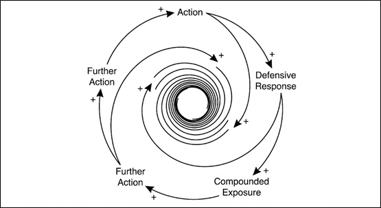 Figure 2 maps the architecture of a system that has lost the ability to self-correct. Each node feeds the next with amplifying force, marked by the positive signs on every arrow: action produces exposure, exposure triggers a defensive response, the defensive response demands further action, and further action deepens the exposure it was meant to contain. The spiral tightens inward not because external pressure increases, but because the system's own outputs become its inputs. There is no negative feedback anywhere in the loop. No stabilising mechanism. No point at which the process naturally decelerates.
