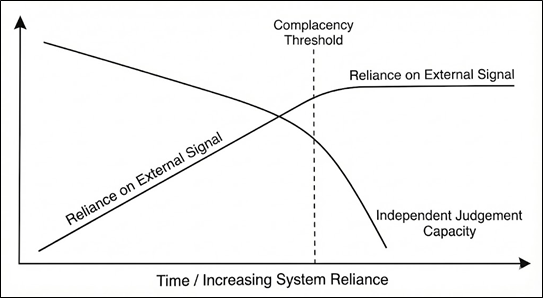 Figure 3 plots the relationship that sits at the centre of the automation-complacency literature. Two variables move across time as system reliance increases. Reliance on external signal rises. Independent judgement capacity declines. For a period, they coexist. The operator uses the system but continues to verify, question, and occasionally override. Then comes the crossover, marked by the dashed line: the complacency threshold. Beyond this point, the operator's reliance on the system exceeds their capacity to independently evaluate what the system produces. And the dynamics after the threshold are not symmetrical. Reliance plateaus because there is a ceiling to delegation. Judgement does not plateau. It accelerates downward, because unused cognitive skills do not hold steady. They decay, and the rate of decay compounds as the feedback that would normally sustain them, the act of thinking independently, is precisely what has been surrendered.