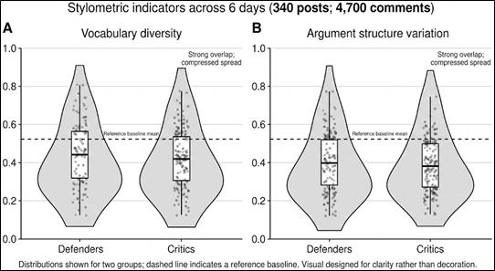 Figure 2. Stylometric indicators show compressed linguistic variation and strong overlap between defenders and critics.